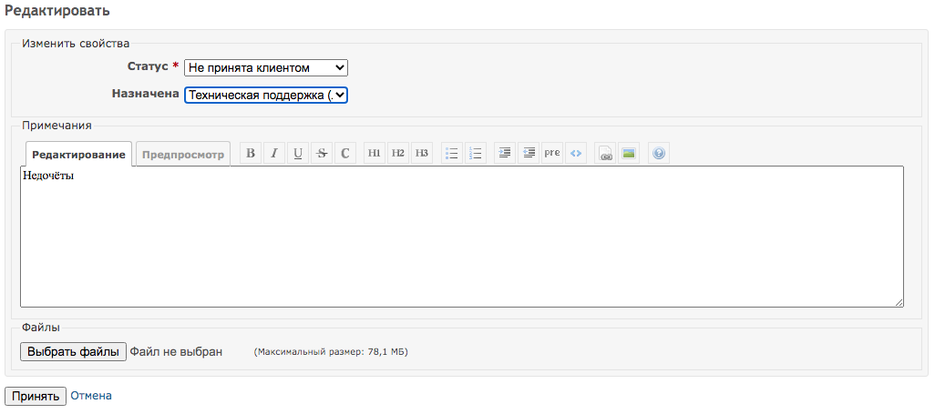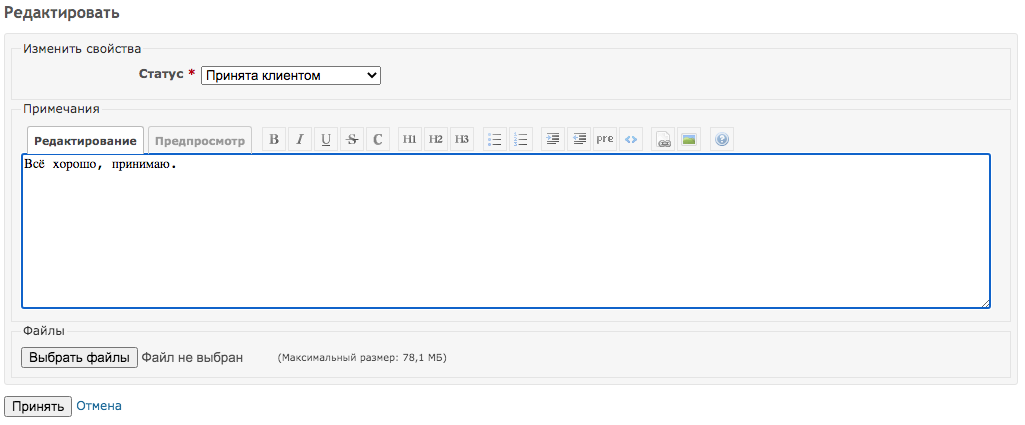 - Принята клиентом – выставляем данный статус, если после уточнения, ничего не нужно дорабатывать или исправлять.