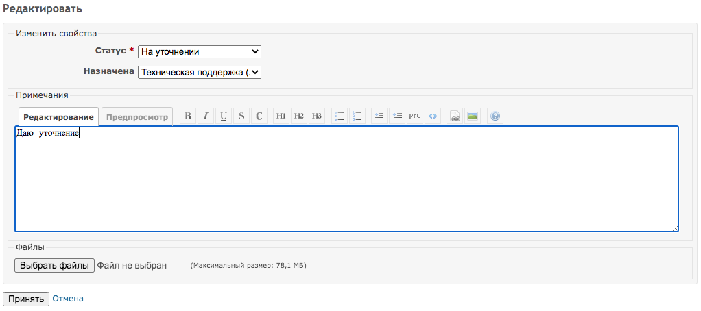 - Примечания – в данном поле оставляем ответ на возникший вопрос от ТП