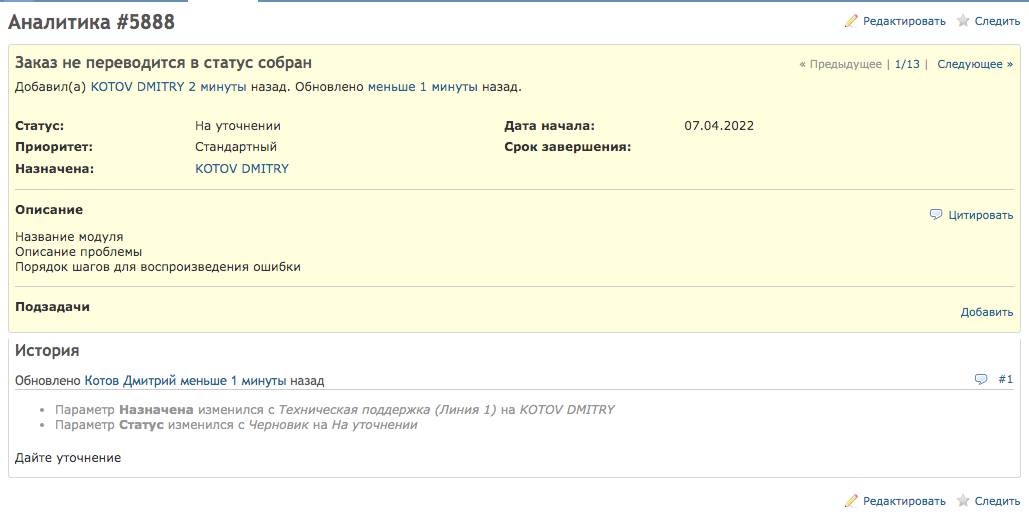 - Если задача на уточнении на вас, вы можете ответить, нажав кнопку «Редактировать»
