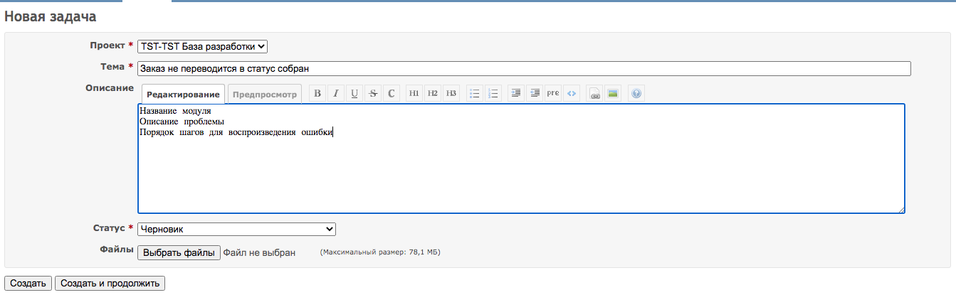 • Черновик - Начальный статус, который принимает новая созданная задача. Может быть отменена. Сотрудниками технической поддержки проводится первичный анализ для последующего принятия в работу и переводится в статус «Поставлена» или «В работе». При недостаточном объеме информации переводится в статус «На уточнении».