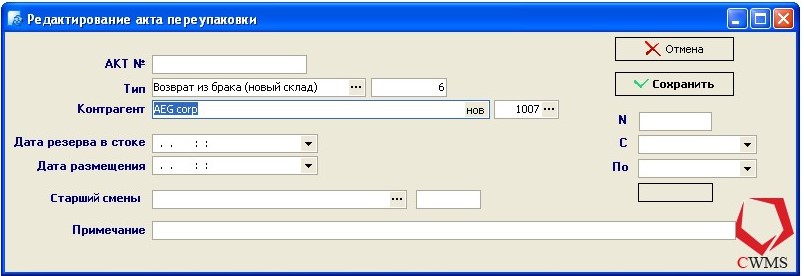 . После этого откроются окна с выбором контрагента, выбора типа акта и даты резерва переупаковываемой номенклатуры.