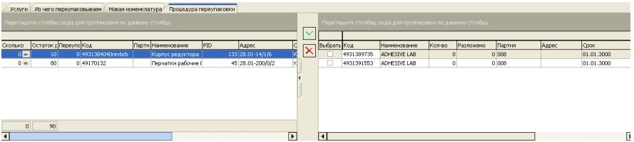 . Если выбранное количество не соответствует заявленному, то в поле «Остаток» в исходной номенклатуре останется разница между подобранным и переупакованным. После этого следует разместить получившуюся номенклатуру.