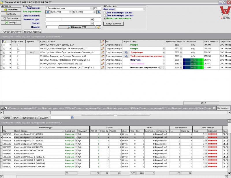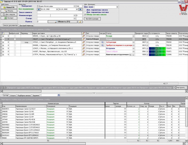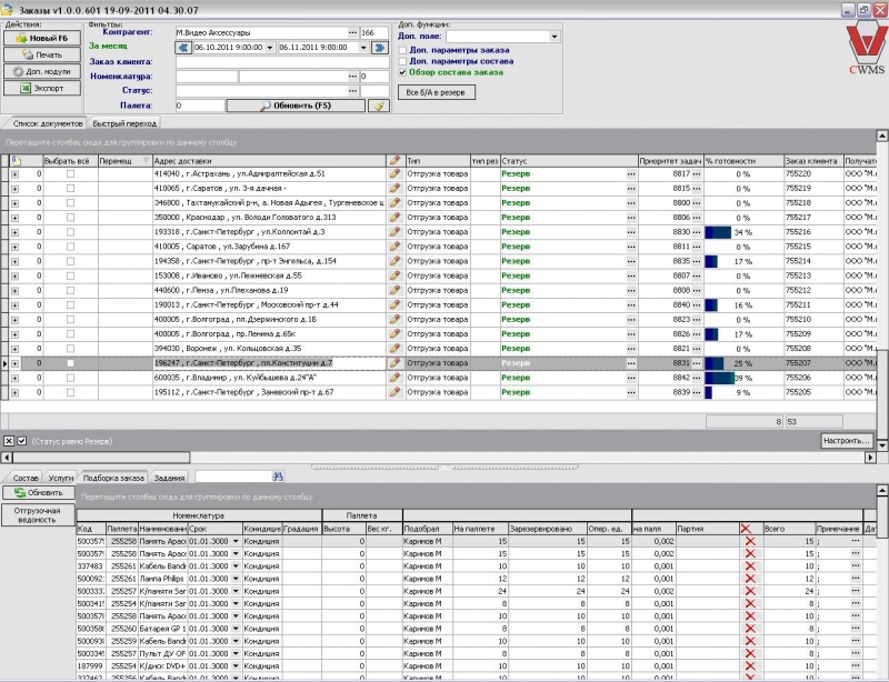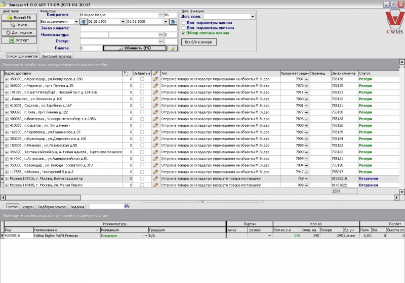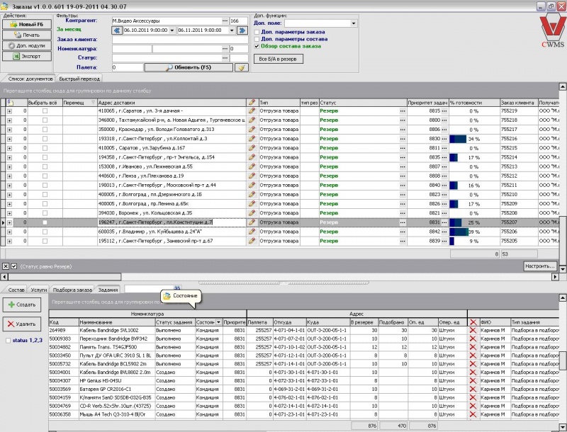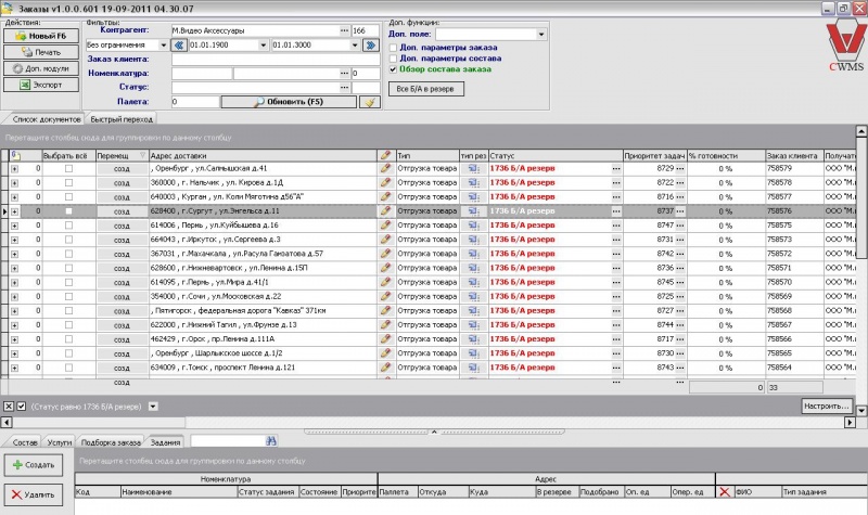 Закладка «Задание»: здесь показаны все созданные задания на подбор товара, созданные программой согласно схеме резерва.