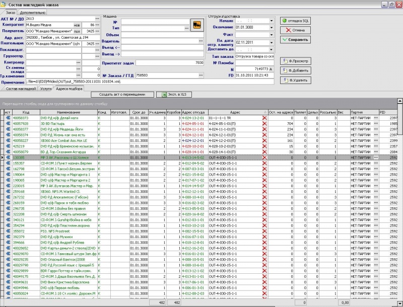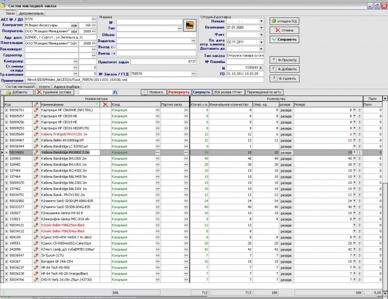 В табличной части есть две основные закладки – «Состав накладной» и «Адреса подбора» В закладке «Состав накладной» содержится информация о товаре и его количестве в заказе (изначальное по документу, зарезервированное по факту наличия) а так же находятся кнопки управления резервом, редактирования и вывода дополнительной информации.