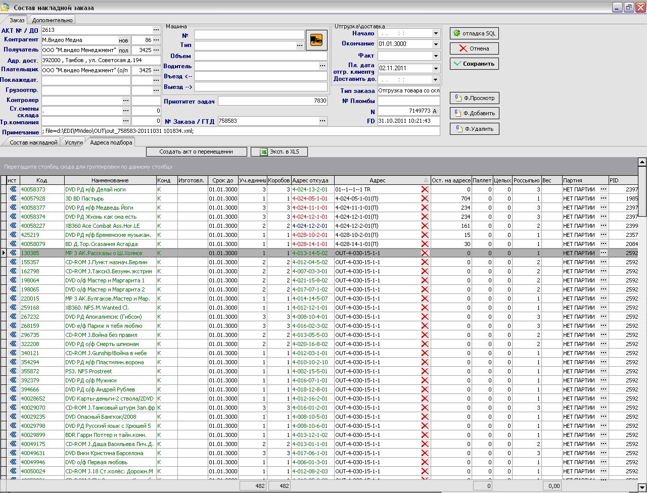 В закладке «Адреса подбора» содержится информация о товаре, адресах его подбора, адресах консолидации собранного, количестве, а так же кнопка удаления подбираемого (иначе кнопка отмены резерва, с возможностью частичной отмены и перемещения на адрес потерянного товара)