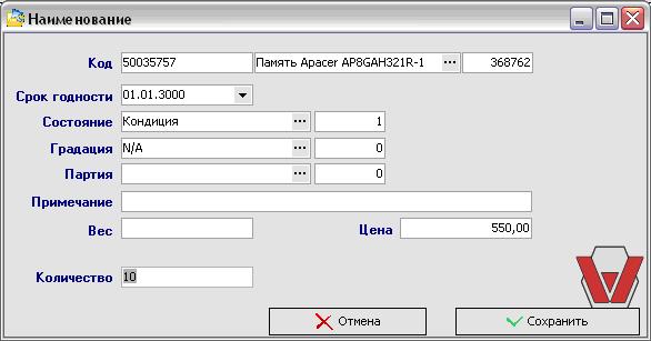 - Кнопка добавления товарной строки (товарной единицы) вручную путем выбора из справочника, при нажатии открывается окно поиска по коду, наименованию или штрих-коду