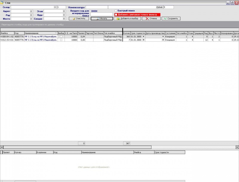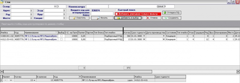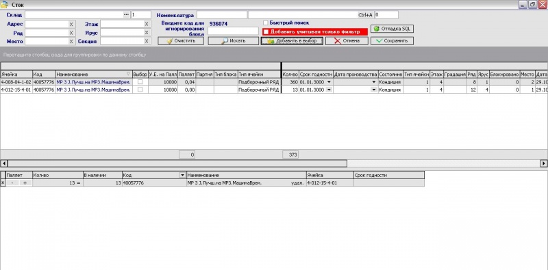 Описание меню окна стока, с возможностью выбора и резервирования товара с определенного адреса или адресов.