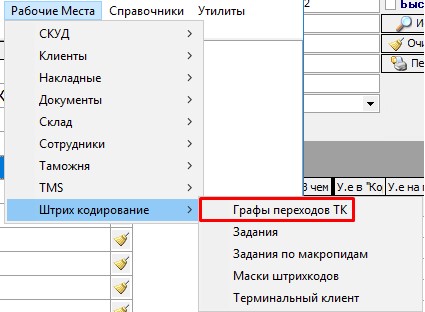 6) После чего идём в Рабочие места -> Штрих кодирование - > Графы переходов ТК
